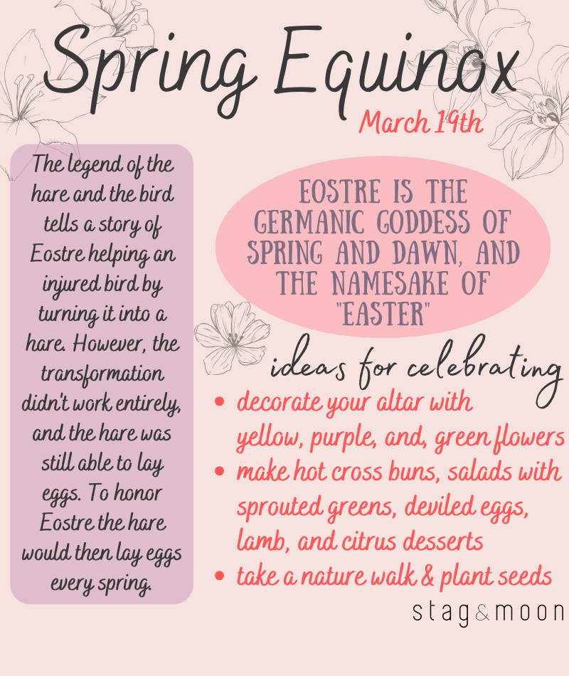 At Spring Equinox, night and day are at an equal length and it is a time of great balance. It is also a time to honor Eostre, the Germanic Goddess of spring and dawn, with festivities celebrating rebirth and renewal. However, very soon, the energy that has been building since Yule, will burst and the Sun will breathe life into nature.